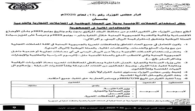 صدر قرار مجلس الوزراء رقم (13) للعام 2025م، بشــأن حظر إستخدام العملات الأجنبية بديلاً عن العملة الوطنية في المعاملات التجارية والخدمية والتعاقدات المالية في الجمهورية.