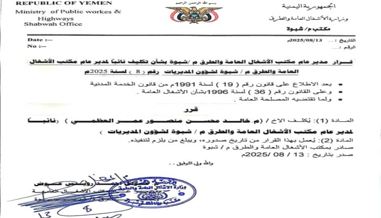 أصدر مدير عام مكتب الأشغال العامة والطرق بمحافظة شبوة الأستاذ عوض أحمد رويس عوض قراراً بتكليف المهندس خالد محسن منصور عمر العظمي نائباً لمدير عام مكتب الأشغال العامة والطرق بمحافظة شبوة لشؤون المديريات رقم 8 لسنة 2025.