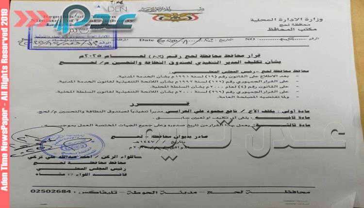 واصدر قرارا اخر بتكليف جلال محسن فضل محسن مديرا عاما لمديرية المسيمير بدلا عن المدير السابق حاميم .