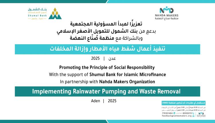 انطلاقًا من مبدأ المسؤولية المجتمعية وحرصًا على صحة وسلامة الأهالي في مدينة عدن، نفّذ بنك الشمول للتمويل الأصغر الإسلامي، بالتعاون مع منظمة صُنّاع النهضة، مبادرة لشفط مياه الأمطار الراكدة وإزالة الركام الذي خلّفته السيول في الشوارع والأحياء.