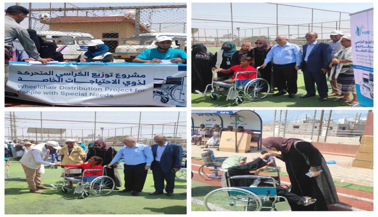 دشنت الدكتورة نجوى فضل المدير التنفيذي لصندوق رعاية وتأهيل المعاقين، ومعها مدير عام مكتب الصحة بعدن الدكتور أحمد البيشي، اليوم، توزيع الكراسي المتحركة والأجهزة الساندة، المقدمة من منظمة بيور هاندز.