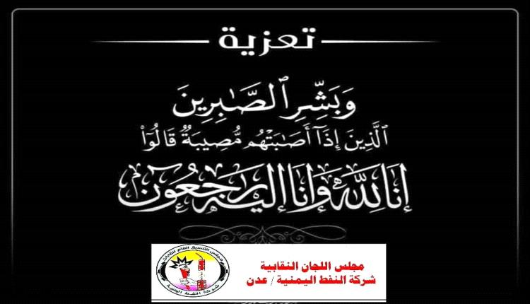 ببالغ الحزن والأسى و بقلوب مكلومة ، ومؤمنة بقضاء الله وقدره يتقدم مجلس قيادة اللجان النقابية- شركة النفط فرع عدن بأحر التعازي والمواساة إلى الأخ عبدالله قائد الهويدي، رئيس المجلس التنسيقي العام لنقابات شركة النفط اليمنية ، رئيس مجلس قيادة اللجان النقابية شركة النفط فرع عدن وذلك بوفاة المغفور لها بإذن الله تعالى السيدة الفاضلة "شقيقته"