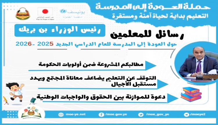 وجّه دولة رئيس الوزراء، الدكتور سالم بن بريك، رسائل مهمة للمعلمين والطلاب في مختلف المحافظات، بمناسبة تدشين العام الدراسي الجديد 2025 – 2026.