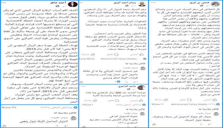 ▪︎أحمد ماهر بعد هبوط الصرف إلى ٣٥٠ خرج علينا بمنشور تحدث فيه بلغة تأكيدية جازمة بأن النزول ناتج عن "خطة مدروسة" اشترطها رئيس الوزراء ستعيد صرف السعودي إلى ٥٧ ريال كمان كان قبل ٢٠١٥ مطبّلًا له واصفاً إياه بالمنقذ، لكن بعد بيان البنك الذي ثبّت السعر عند ٤٢٥ شراء و٤٢٨ بيع وأكّد أن النزول وهمي انقلب بسرعة ووجّه التطبيل هذه المرّة للمحافظ ناقلاً البيان بحرفيته ثم راح يوبّخ الناس قائلاً "إنهم ليسوا تجار عملة حتى يشتروا ويبيعوا بهذا الشكل" مع أن منشوره الأوّل هو من دفعهم لبيع مدخراتهم من العملات الأجنبيّة في شركات الصرافة.