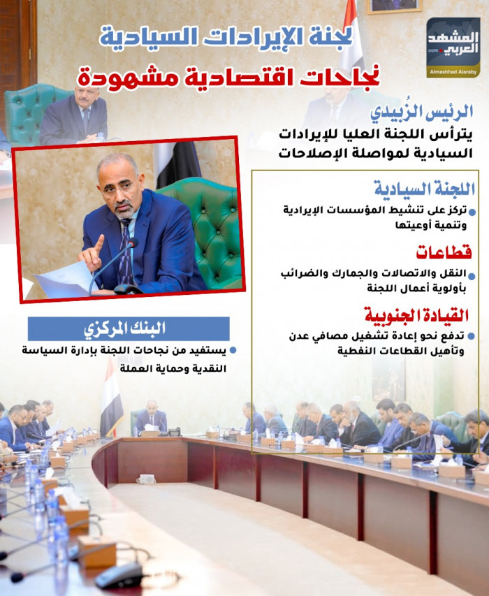 تواصل اللجنة العليا للإيرادات السيادية والمحلية، بقيادة الرئيس عيدروس الزُبيدي، رئيس المجلس الانتقالي الجنوبي، نائب رئيس مجلس القيادة، الإصلاحات الاقتصادية، لتنشيط المؤسسات الإيرادية وتنمية أوعيتها.