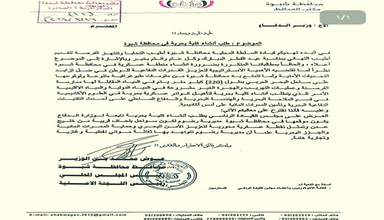 كشفت وثيقة عن تقديم قيادة السلطة المحلية في محافظة شبوة، ممثلة بالمحافظ عوض الوزير، بطلب رسمي إلى وزير الدفاع لإنشاء أول كلية بحرية متكاملة في الجنوب، تكون مقرها المحافظة، لما تمتاز به من موقع استراتيجي على البحر العربي وشريط ساحلي يتجاوز طوله (220 كم).