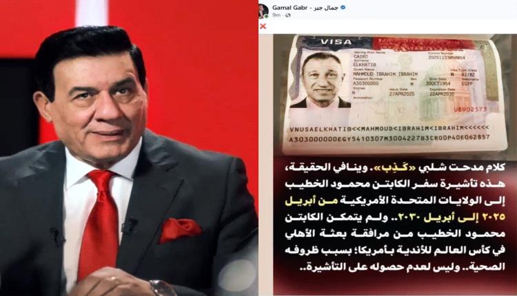 وقال جمال جبر عبر صفحته الرسمية بموقع التواصل الاجتماعي فيسبوك: "كلام مدحت شلبي كذب وينافي الحقيقة، هذه تأشيرة سفر محمود الخطيب إلى الولايات المتحدة الأمريكية من أبريل/نيسان 2025".