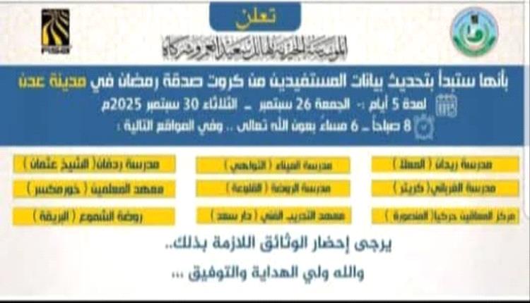 أعلنت المؤسسة الخيرية لهائل سعيد أنعم عن تحديث البيانات للمستفيدين من صدقة رمضان في مدينة عدن.