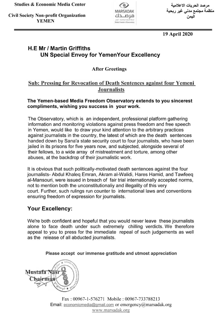 MFO urges UN Yemen envoy to press for scrapping death sentence against journalists