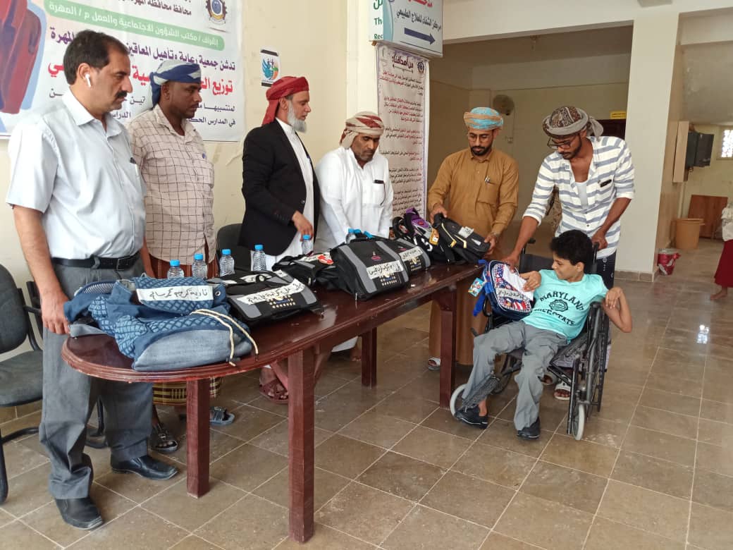 جمعية رعاية وتأهيل المعاقين حركيا بالمهرة تدشن توزيع الزي و الحقيبة المدرسية لطلابها بالمدارس الحكومية و الاهلية