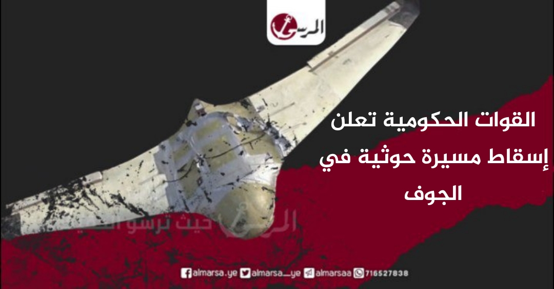 أفاد مصدر عسكري، السبت 11 يناير/كانون الثاني 2026، بإسقاط قوات الجيش بالمنطقة العسكرية السادسة طائرة مسيرة تابعة لجماعة الحوثي المصنفة دوليًا في قوائم الإرهاب، بمحافظة الجوف (شمال شرقي اليمن).