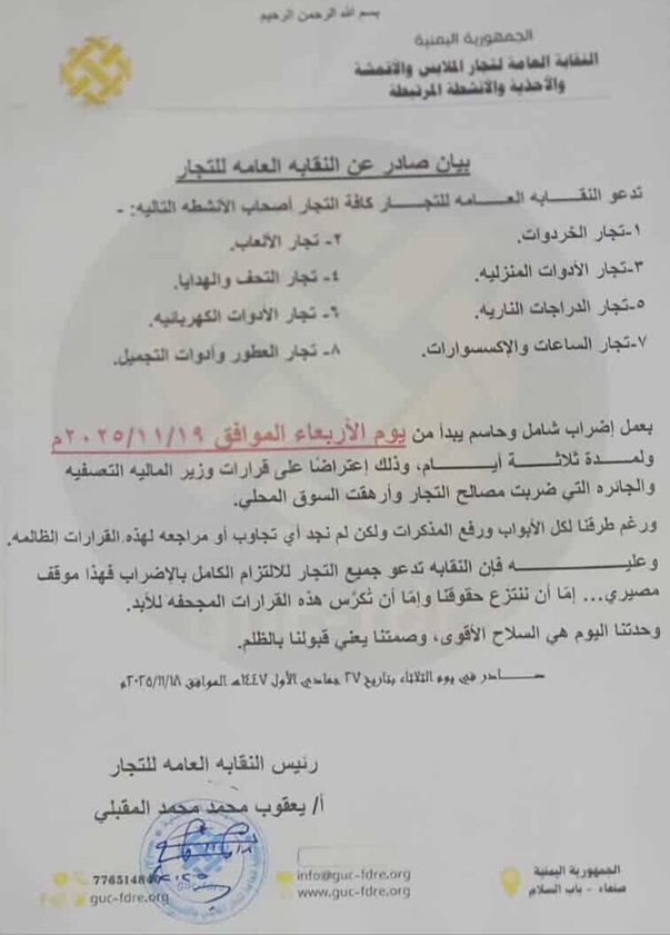 الشاهد برس | صنعاء. أعلنت النقابة العامة لتجار الملابس والأقمشة والأحذية والأنشطة المرتبطة، عن بدء إضراب شامل يمتد لثلاثة أيام ابتداءً من الأربعاء 19 نوفمبر 2025، احتجاجاً على ما وصفتها بـ”القرارات التعسفية والجائرة” الصادرة عن وزير المالية، والتي قالت إنها وجهت ضربة قاسية لمصالح التجار وأثقلت السوق المحلي بأعباء غير مسبوقة. ودعت النقاب